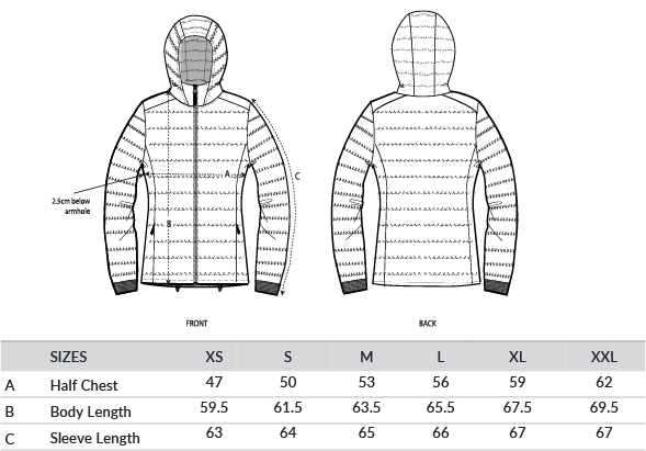Set-in sleeve. High collar with detachable hood and matte metal hidden snaps. Hood opening and bottom hem with adjustable plastic stopper and elastic cord. Reverse nylon zip at centre front. Zipped welt pockets with extra grosgrain pull. Fully quilted. Side panels for better shape. Soft 1x1 rib at sleeve hem. Global Recycled Standard certified. Vegan certified.