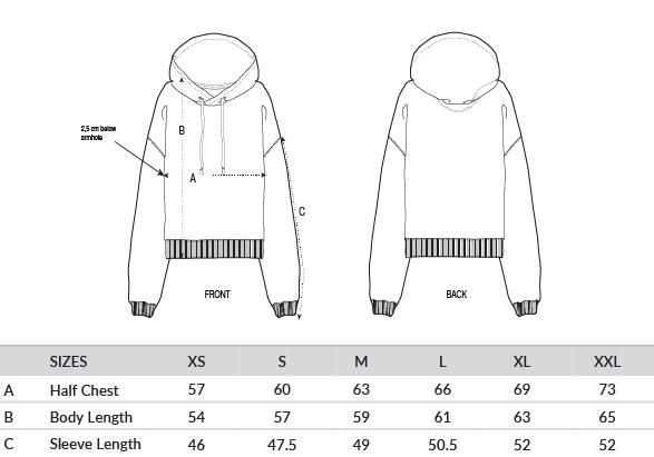 Set-in sleeves. Dropped shoulders. Double-layered hood in self-fabric. Flat drawcord in matching body colour. Embroidered eyelet. 1x1 ribs at sleeve cuffs and bottom hem. Two-needle topstitches on all seams. Inside grosgrain back neck tape. Self-fabric half moon at back neck.